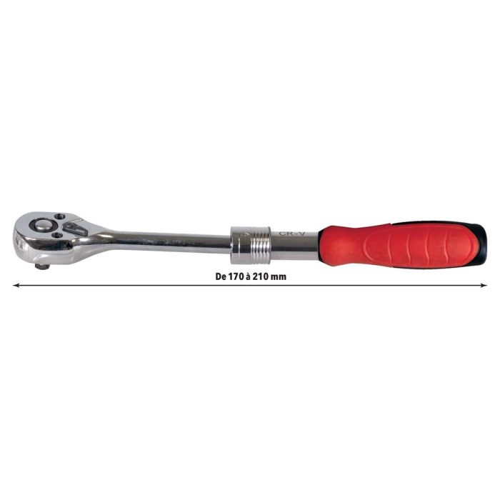 Cliquet 1/4" 72 dents réversible télescopique avec bouton poussoir, poignée bi-matière et manche droit.